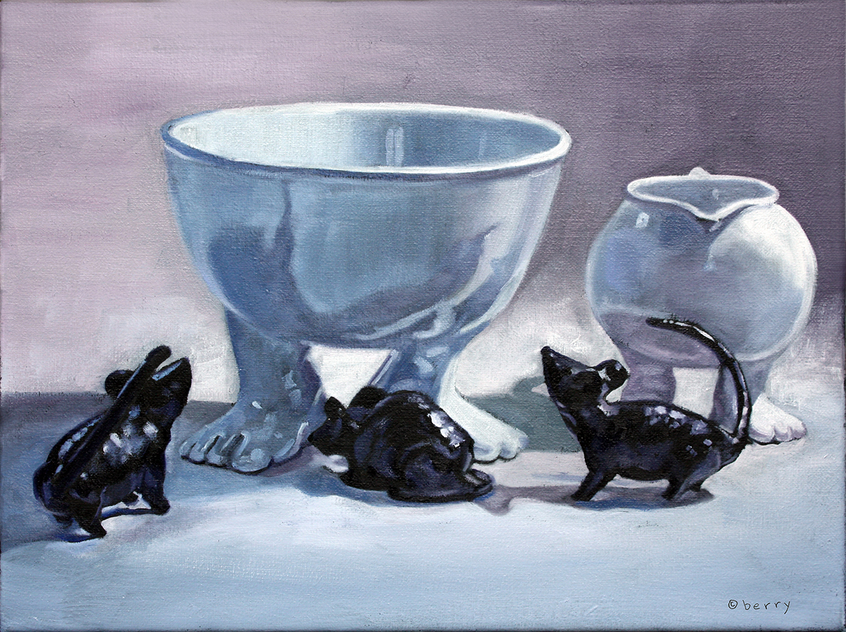 In case it's not obvious, this months' challenge subject was "rodents", chosen by group leader Diana. A fun one I think. These "mice" reside on one of my end tables, standing watch over a framed photo of Tim and I. I saw them in a Pottery Barn catalog as decoration for Halloween. I thought they were adorable and bought them for everyday use. I have no idea why they spend their day looking at a photo of us, but they haven't complained so far.